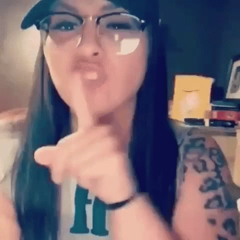 A woman in glasses and a hat performs a 'real talk' hand gesture, bringing her finger to her lips.