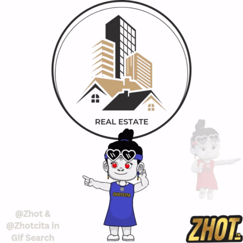 A cartoon girl with heart-shaped sunglasses points to a circular real estate logo featuring buildings and houses.