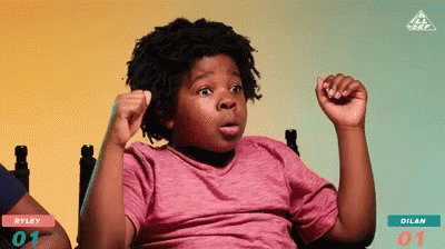 A young boy with curly hair reacts with wide eyes and raised hands in a moment of surprise or realization.