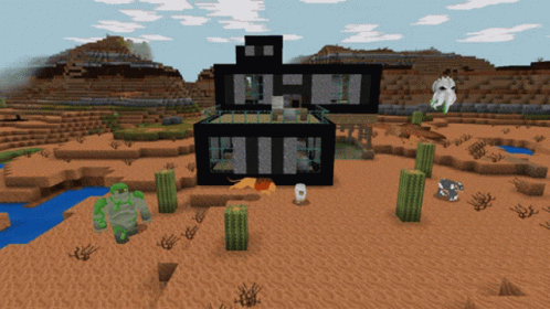 Explore a vibrant Realmcraft Minecraft desert world featuring a modern black house and various fantasy creatures.