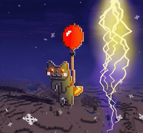 Funny pixel art cat with a red balloon gets struck by lightning in Realmcraft Minecraft.