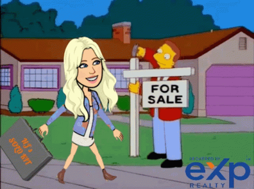 A cartoon realtor, resembling a Bitmoji, walks past a Homer Simpson-like character putting up a 'For Sale' sign.