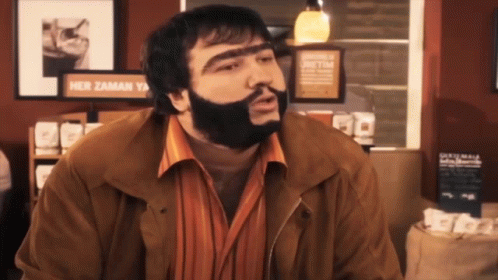 Recep, a man with a beard, exclaims "Hadi la!" in a cafe setting, wearing a brown jacket and striped shirt.