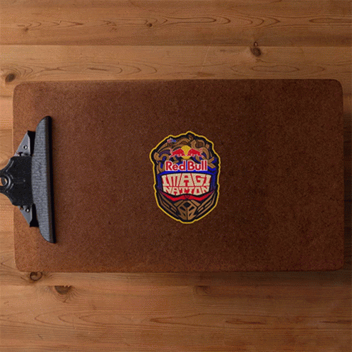A wooden clipboard featuring a vibrant Red Bull Imagination logo sticker, resting on a wooden surface.