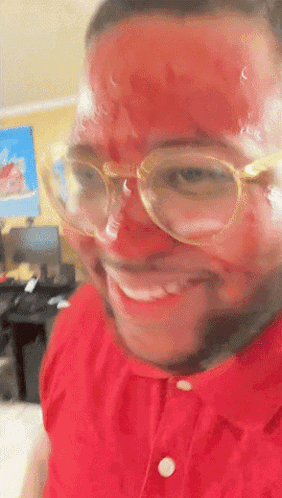 a man wearing glasses and a red shirt has a red face