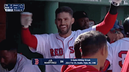 J.D. Martinez of the Red Sox celebrates in the dugout after a strong performance, raising his arms in excitement.