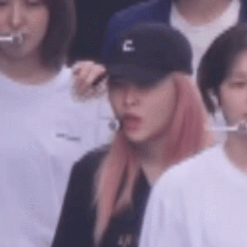 Red Velvet's Yeri, with pink hair and a cap, yawns widely during an event.