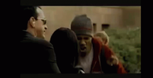 Redman is seen barking in the background while a man in a suit and sunglasses talks to a woman.