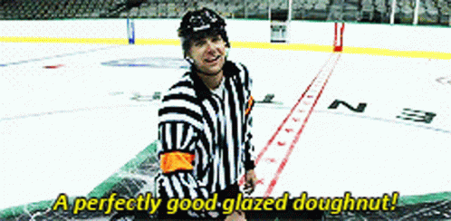 A hockey referee holds up a glazed doughnut, declares it 'perfectly good,' then drops it on the ice.
