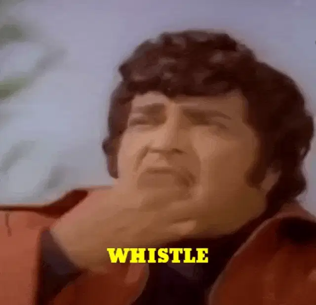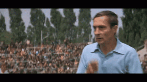 A referee in a blue shirt blows his whistle and points, seemingly indicating a violation during a game in a stadium.