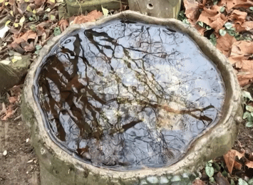 Bare tree branches reflect clearly in the still water of a birdbath surrounded by autumn leaves.