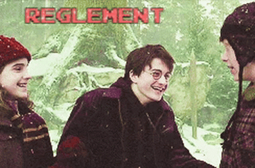 Harry Potter, Hermione, and Ron share a laugh in the snow with 'REGLEMENT' text overlay.