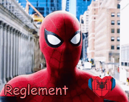 Close-up of Spider-Man's suit, featuring Tom Holland, with 'Reglement' text and heart logo.