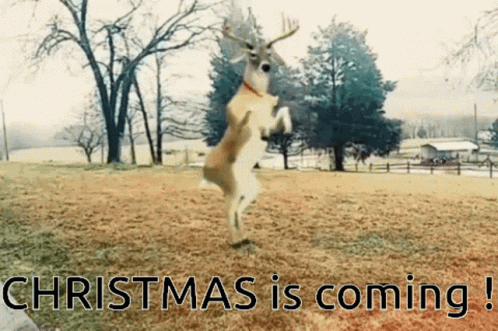A festive deer stands on its hind legs and 'dances' in a field, announcing 'CHRISTMAS is coming !'