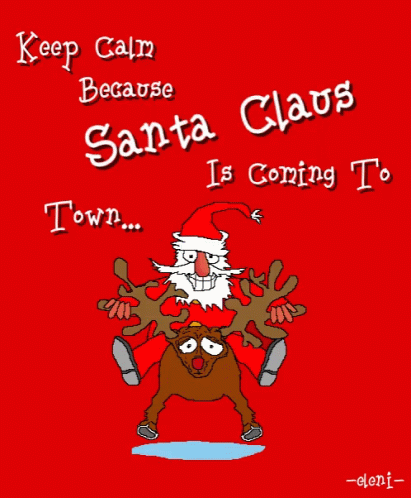 A festive cartoon features Santa Claus riding a reindeer with the message: "KEEP CALM BECAUSE SANTA IS COMING TO TOWN."
