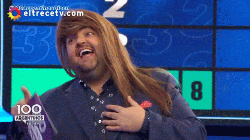 Dario Barassi, wearing a wig, laughs heartily on the set of "100 Argentinos Dicen."