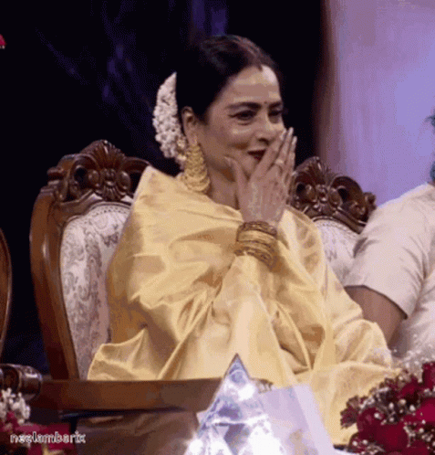 Rekha Rekhaji smiling and covering her mouth, wearing a yellow outfit at a Telugu event.
