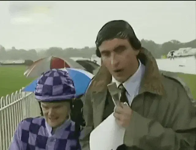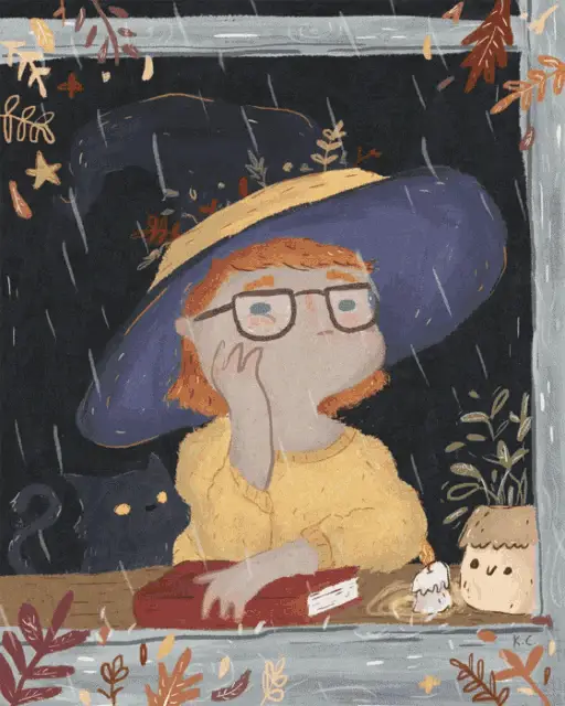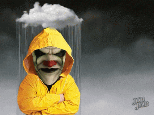 Rellik The Clown stands in a yellow raincoat, with a personal rain cloud pouring only on him.