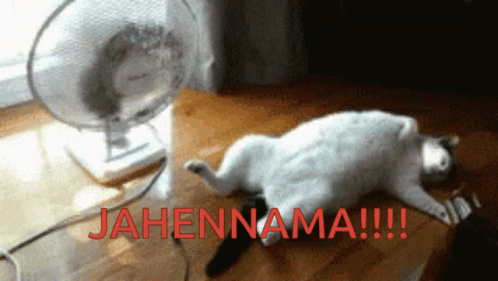 A cat lies dramatically in front of a fan to cool down, with the text 'JAHENNAMA!!!!' overlaid.