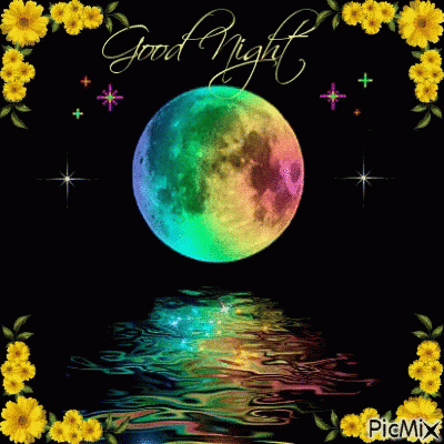 Renee's beautiful good night message featuring a vibrant rainbow moon reflected on water, framed by yellow flowers.