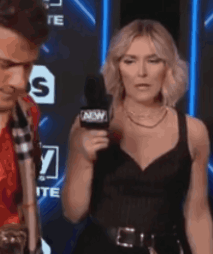 Renee Paquette, an AEW reporter, looks annoyed and not amused during a backstage interview.