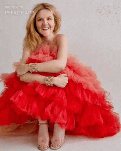 Renée Slater poses in a stunning red ruffled dress, sitting with her arms crossed.