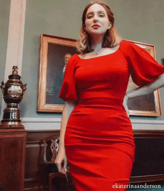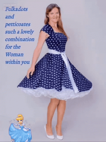 Renée Slater models a blue polkadot dress with a white petticoat, embodying a lovely combination.