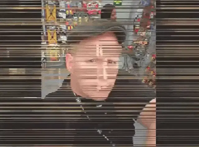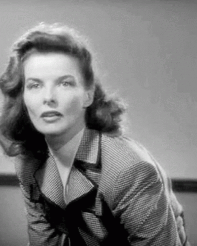 Renée Slater, also known as Katherine, captured in a classic black and white clip, wearing a stylish plaid jacket.
