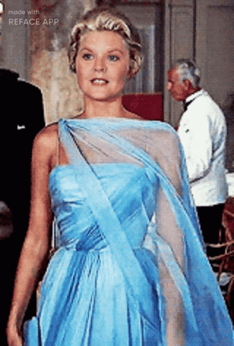 Renée Slater looks stunning in an elegant light blue chiffon dress at a formal event.