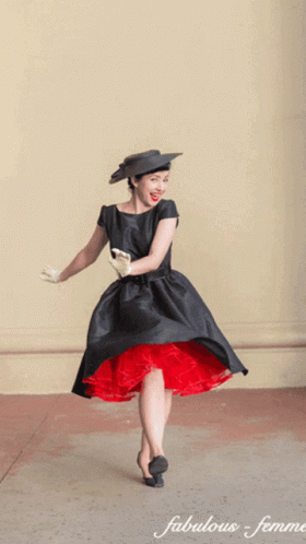 Renée Slater gracefully dances in a black vintage dress with a vibrant red petticoat, showcasing her elegant style.