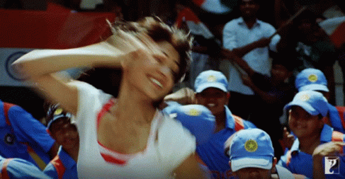 Energetic Republic Day celebration in India with a woman dancing amidst a cheering crowd and Indian flags.