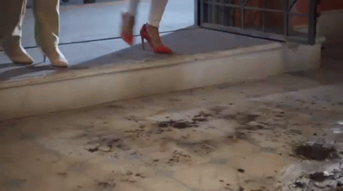 A person in red high heels dramatically slips and falls on a dirty sidewalk.