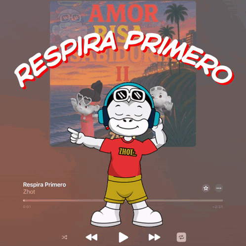 Animated character Zhot with headphones promotes 'Respira Primero' song, emphasizing calm and mindfulness.