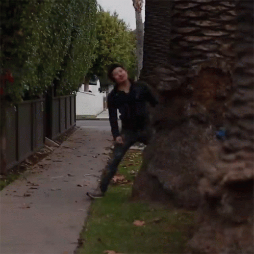 Guy Tang playfully reveals himself from behind a large tree on a sidewalk, making a surprise appearance.