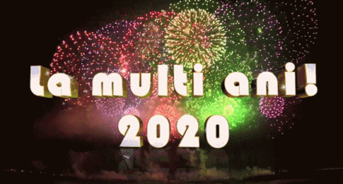 Vibrant fireworks light up the night sky, celebrating New Year 2020 with the greeting 'La multi ani!'.