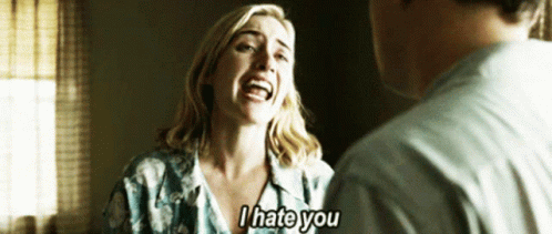 Kate Winslet as April Wheeler confronts a man, expressing intense emotion with 'I hate you' in Revolutionary Road.