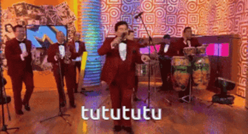 A vibrant live band performs on stage with men in red suits, singing and playing instruments. Text 'tutututu' appears. Related to Daisy Ridley and Rey.
