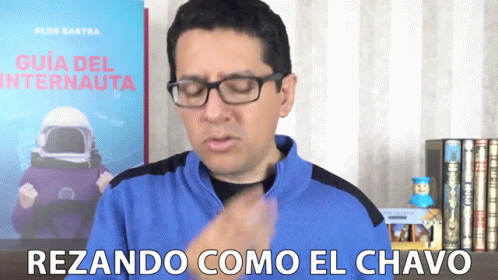 Man explains how to pray like El Chavo, with a book titled 'Guía del Internauta' in the background.
