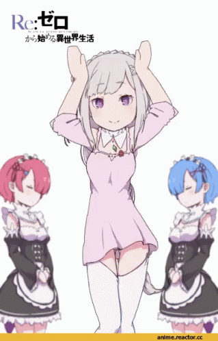 Emilia from Re:Zero poses playfully, flanked by chibi versions of Ram and Rem in their maid outfits.