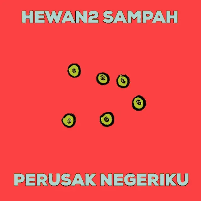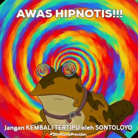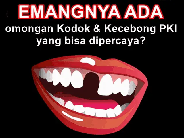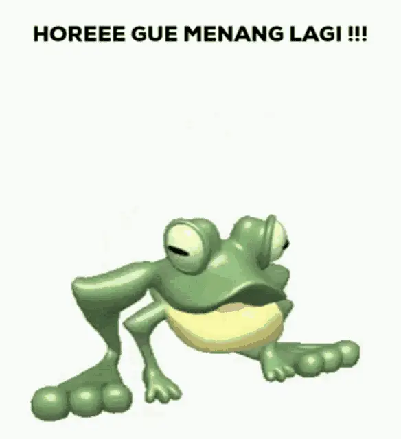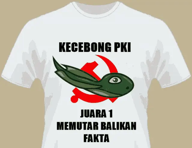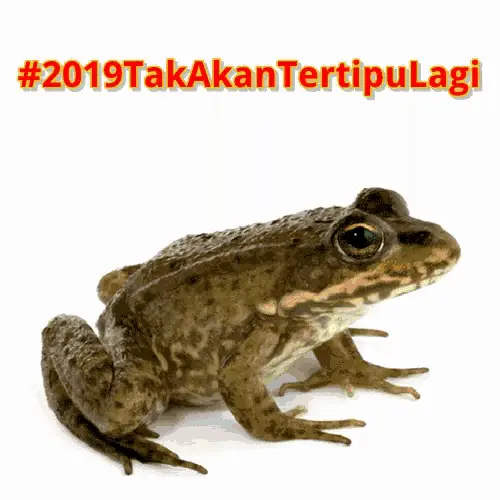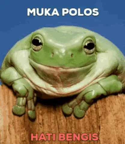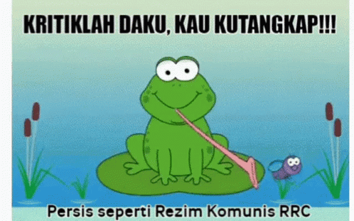 An animated frog with a long tongue catches a fly, accompanied by Indonesian text criticizing a communist regime.