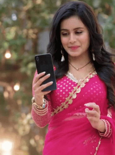 Rhea Sharma as Mishti laughing joyfully while looking at her phone, dressed in a beautiful pink saree.