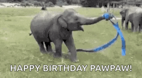 A playful baby elephant joyfully performs a 'ribbon dance' with a blue streamer, celebrating 'Happy Birthday Pawpaw!'