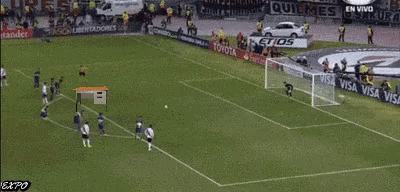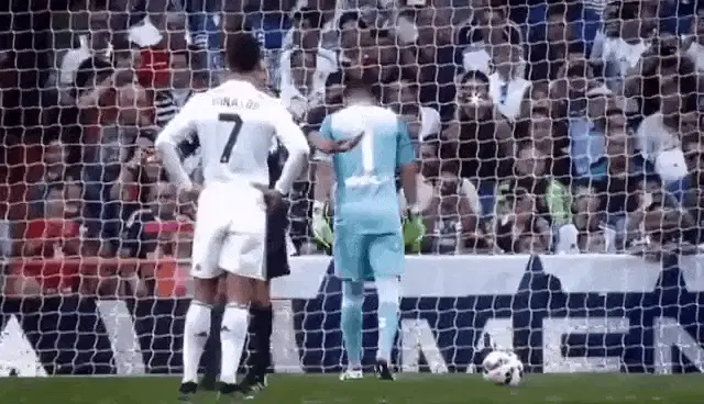 Riber Escritorio takes a penalty kick in a soccer match, with the ball shot towards the goal.