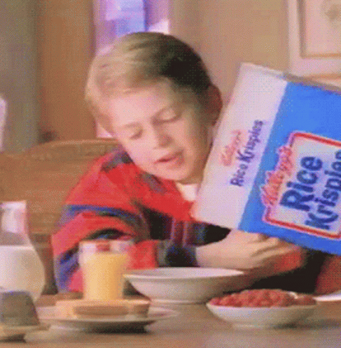 A young boy pours Kellogg's Rice Krispies cereal into a bowl at the breakfast table.