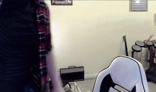 Richard Right Then and Rich Right Then pulling up trousers in a room with a drum set and gaming chair.