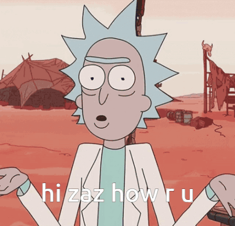 Rick Sanchez from Rick and Morty shrugging, with the caption 'hi zaz how ru'.