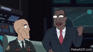 The President (The Dream) animated character talks intensely to General Washington in a control room.