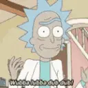 Rick from Rick and Morty enthusiastically exclaims his famous catchphrase, 'Wubba Lubba Dub Dub!'