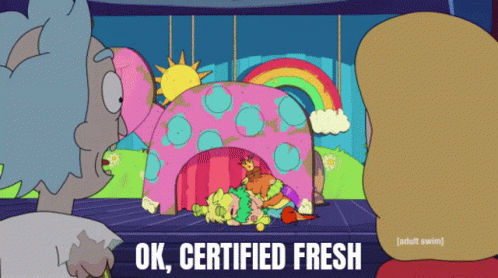 Rick and Beth from Rick and Morty in Froopyland, with Rick declaring it 'Certified Fresh'.