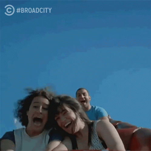 Ilana Glazer and friends from Broad City are seen screaming and laughing on a thrilling roller coaster ride.